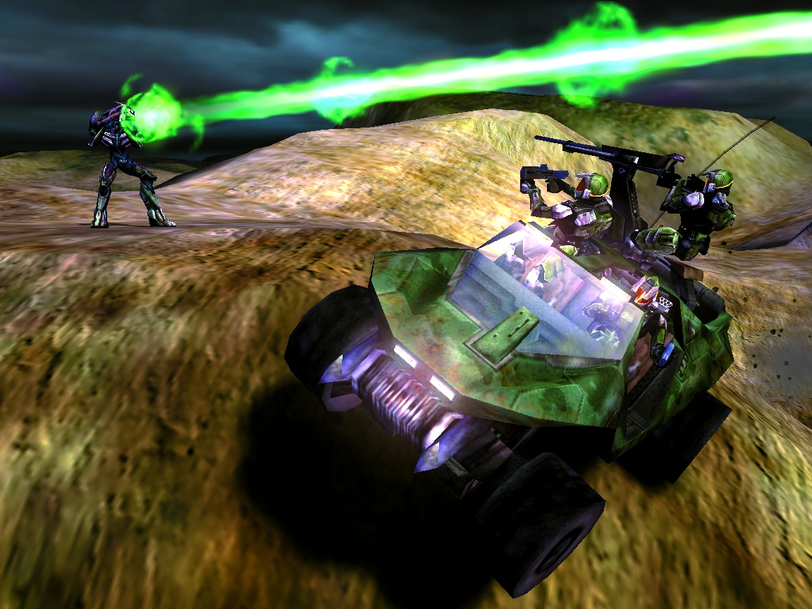 War of the worldsAlien hovercrafts slowly glide down a hill, alien flying vehicles patrol their areas. Behind one such hill, human marines are creeping up to launch an assault on the aliens. Suddenly shots are fired at the first alien vehicle, marines make huge leaps towards the enemy and at the same time ahuge jeep comes roaring out of the hills, with two marines both firing their weapons. The jeep gets knocked over at a curve, and the marines fall out, but they quickly stand up and continue firing. This is somewhat how your missions in Halo will look like. A typical thing in this game will be the choice of what you want to do, be it a sniper, jeep driver or infantry, and if you want you can choose to be the same type of marine all the way through. In this game you don't make huge attacks with large, heavy vehicles, rather, you plan small surprise attacks with flexible and light infantry. Later in the game this could change, because your troops might grab larger alien machinery and use it against them, i.e. you can use the alien hovering craft. Not only do you simple attack and battle enemies in this game, you can also get a mission where you must search team mates and free them from captivity.