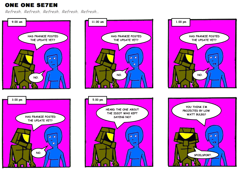On April 30, 2003, Stuntmutt began turning in episodes of a new comic known as One One Se7en. We'll present them here, in the order in which they were submitted, as they come in. New submissions were added Monday, Wednesday, and Friday. On March 3, 2008, One One Se7en was retired from regular releases - Stunt's life got a tad too busy for 3 strips per week. (He still comes by with new content when the situation arises, however.)