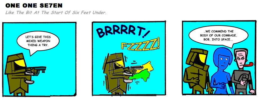 On April 30, 2003, Stuntmutt began turning in episodes of a new comic known as One One Se7en. We'll present them here, in the order in which they were submitted, as they come in. New submissions were added Monday, Wednesday, and Friday. On March 3, 2008, One One Se7en was retired from regular releases - Stunt's life got a tad too busy for 3 strips per week. (He still comes by with new content when the situation arises, however.)