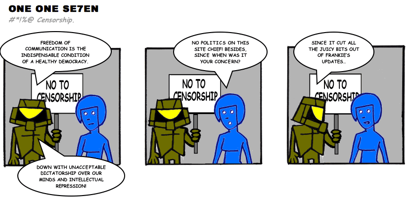 On April 30, 2003, Stuntmutt began turning in episodes of a new comic known as One One Se7en. We'll present them here, in the order in which they were submitted, as they come in. New submissions were added Monday, Wednesday, and Friday. On March 3, 2008, One One Se7en was retired from regular releases - Stunt's life got a tad too busy for 3 strips per week. (He still comes by with new content when the situation arises, however.)