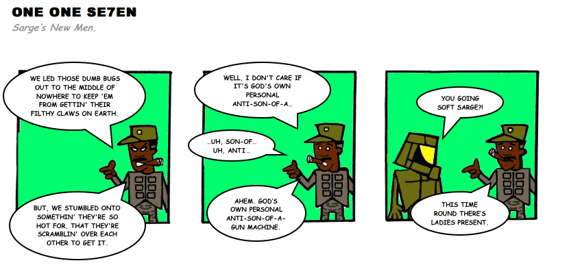 On April 30, 2003, Stuntmutt began turning in episodes of a new comic known as One One Se7en. We'll present them here, in the order in which they were submitted, as they come in. New submissions were added Monday, Wednesday, and Friday. On March 3, 2008, One One Se7en was retired from regular releases - Stunt's life got a tad too busy for 3 strips per week. (He still comes by with new content when the situation arises, however.)