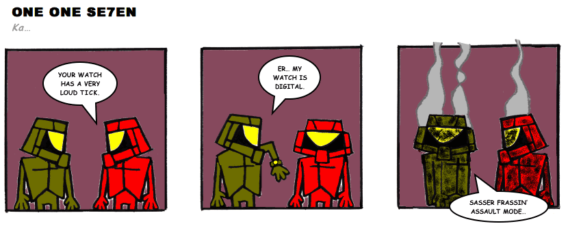 On April 30, 2003, Stuntmutt began turning in episodes of a new comic known as One One Se7en. We'll present them here, in the order in which they were submitted, as they come in. New submissions were added Monday, Wednesday, and Friday. On March 3, 2008, One One Se7en was retired from regular releases - Stunt's life got a tad too busy for 3 strips per week. (He still comes by with new content when the situation arises, however.)