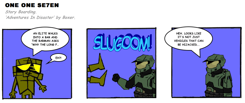 On April 30, 2003, Stuntmutt began turning in episodes of a new comic known as One One Se7en. We'll present them here, in the order in which they were submitted, as they come in. New submissions were added Monday, Wednesday, and Friday. On March 3, 2008, One One Se7en was retired from regular releases - Stunt's life got a tad too busy for 3 strips per week. (He still comes by with new content when the situation arises, however.)