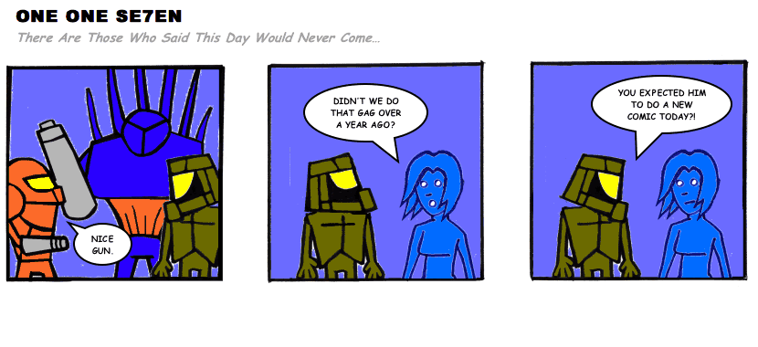 On April 30, 2003, Stuntmutt began turning in episodes of a new comic known as One One Se7en. We'll present them here, in the order in which they were submitted, as they come in. New submissions were added Monday, Wednesday, and Friday. On March 3, 2008, One One Se7en was retired from regular releases - Stunt's life got a tad too busy for 3 strips per week. (He still comes by with new content when the situation arises, however.)