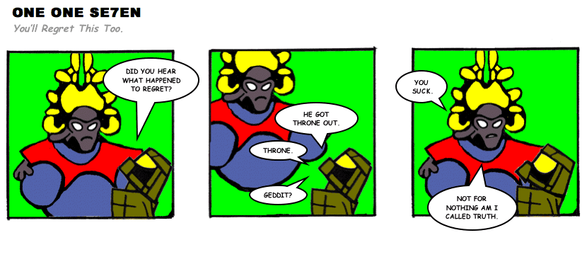 On April 30, 2003, Stuntmutt began turning in episodes of a new comic known as One One Se7en. We'll present them here, in the order in which they were submitted, as they come in. New submissions were added Monday, Wednesday, and Friday. On March 3, 2008, One One Se7en was retired from regular releases - Stunt's life got a tad too busy for 3 strips per week. (He still comes by with new content when the situation arises, however.)