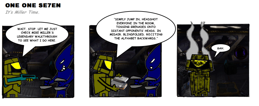 On April 30, 2003, Stuntmutt began turning in episodes of a new comic known as One One Se7en. We'll present them here, in the order in which they were submitted, as they come in. New submissions were added Monday, Wednesday, and Friday. On March 3, 2008, One One Se7en was retired from regular releases - Stunt's life got a tad too busy for 3 strips per week. (He still comes by with new content when the situation arises, however.)