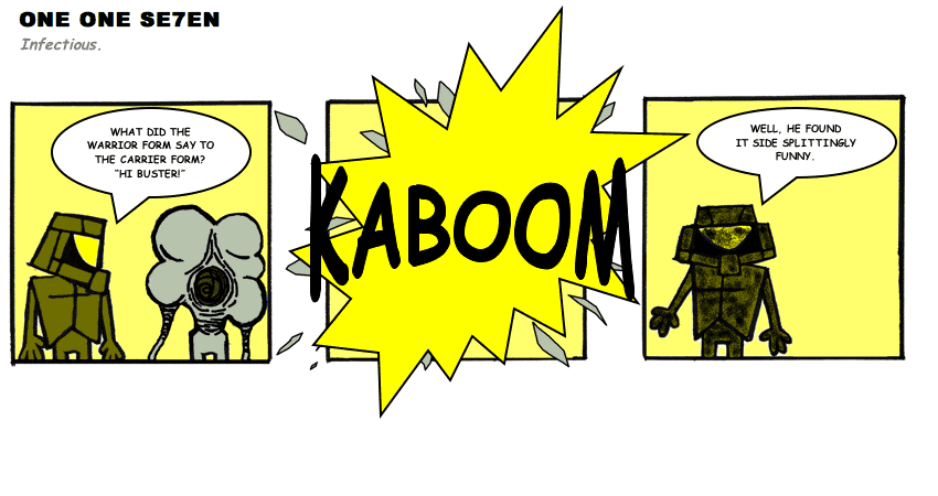 On April 30, 2003, Stuntmutt began turning in episodes of a new comic known as One One Se7en. We'll present them here, in the order in which they were submitted, as they come in. New submissions were added Monday, Wednesday, and Friday. On March 3, 2008, One One Se7en was retired from regular releases - Stunt's life got a tad too busy for 3 strips per week. (He still comes by with new content when the situation arises, however.)
