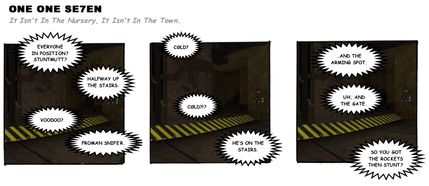 On April 30, 2003, Stuntmutt began turning in episodes of a new comic known as One One Se7en. We'll present them here, in the order in which they were submitted, as they come in. New submissions were added Monday, Wednesday, and Friday. On March 3, 2008, One One Se7en was retired from regular releases - Stunt's life got a tad too busy for 3 strips per week. (He still comes by with new content when the situation arises, however.)