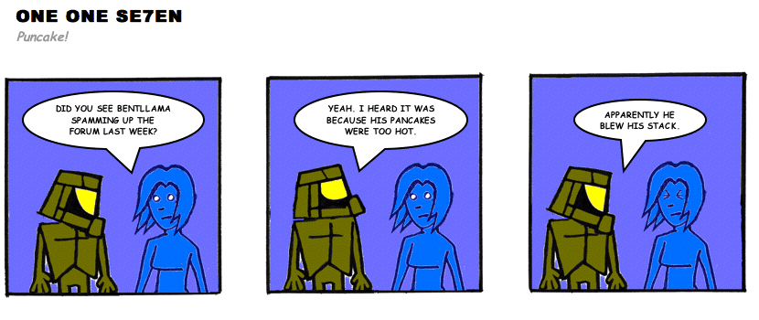 On April 30, 2003, Stuntmutt began turning in episodes of a new comic known as One One Se7en. We'll present them here, in the order in which they were submitted, as they come in. New submissions were added Monday, Wednesday, and Friday. On March 3, 2008, One One Se7en was retired from regular releases - Stunt's life got a tad too busy for 3 strips per week. (He still comes by with new content when the situation arises, however.)