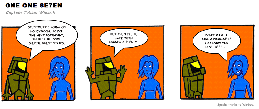 On April 30, 2003, Stuntmutt began turning in episodes of a new comic known as One One Se7en. We'll present them here, in the order in which they were submitted, as they come in. New submissions were added Monday, Wednesday, and Friday. On March 3, 2008, One One Se7en was retired from regular releases - Stunt's life got a tad too busy for 3 strips per week. (He still comes by with new content when the situation arises, however.)