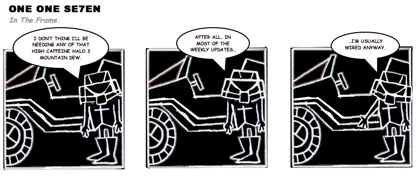 On April 30, 2003, Stuntmutt began turning in episodes of a new comic known as One One Se7en. We'll present them here, in the order in which they were submitted, as they come in. New submissions were added Monday, Wednesday, and Friday. On March 3, 2008, One One Se7en was retired from regular releases - Stunt's life got a tad too busy for 3 strips per week. (He still comes by with new content when the situation arises, however.)