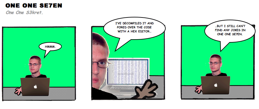 On April 30, 2003, Stuntmutt began turning in episodes of a new comic known as One One Se7en. We'll present them here, in the order in which they were submitted, as they come in. New submissions were added Monday, Wednesday, and Friday. On March 3, 2008, One One Se7en was retired from regular releases - Stunt's life got a tad too busy for 3 strips per week. (He still comes by with new content when the situation arises, however.)