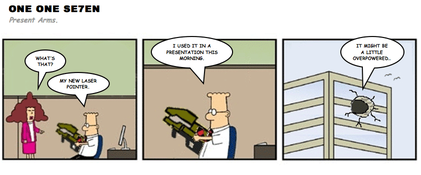 On April 30, 2003, Stuntmutt began turning in episodes of a new comic known as One One Se7en. We'll present them here, in the order in which they were submitted, as they come in. New submissions were added Monday, Wednesday, and Friday. On March 3, 2008, One One Se7en was retired from regular releases - Stunt's life got a tad too busy for 3 strips per week. (He still comes by with new content when the situation arises, however.)