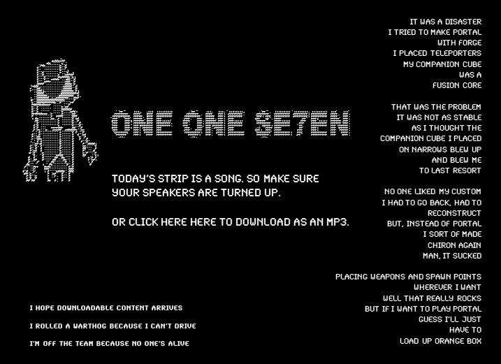 On April 30, 2003, Stuntmutt began turning in episodes of a new comic known as One One Se7en. We'll present them here, in the order in which they were submitted, as they come in. New submissions were added Monday, Wednesday, and Friday. On March 3, 2008, One One Se7en was retired from regular releases - Stunt's life got a tad too busy for 3 strips per week. (He still comes by with new content when the situation arises, however.)