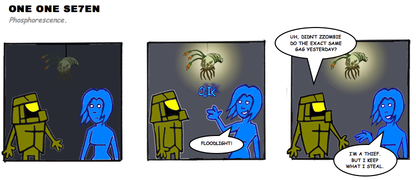 On April 30, 2003, Stuntmutt began turning in episodes of a new comic known as One One Se7en. We'll present them here, in the order in which they were submitted, as they come in. New submissions were added Monday, Wednesday, and Friday. On March 3, 2008, One One Se7en was retired from regular releases - Stunt's life got a tad too busy for 3 strips per week. (He still comes by with new content when the situation arises, however.)